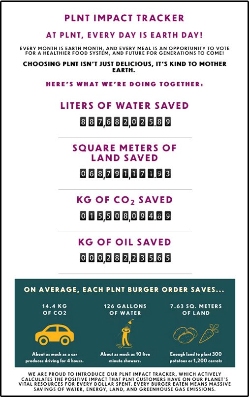 The PLNT Impact Tracker on PLNT Burger’s website wants you to think about what you’re eating. The tracker, which appears on the website of this East Coast vegan chain and on its ordering app, estimates the amounts of water, land, CO2, and oil saved by eating vegan burgers. The numbers—14.4 kg of CO2 saved per burger, for instance—are derived from the 2022 environmental, social, and governance (ESG) report of the vegan brand Beyond Meat, from which PLNT Burger gets its patties.