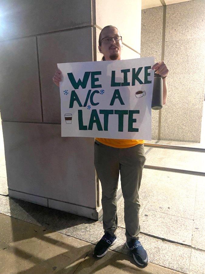 Eventually, it got to be too much. Austin says that workers in the store went back and forth with management on repairs for their air conditioner for weeks, resulting only in temporary fixes that would break down again. Then, they decided to go on strike to demand a permanent solution. Workers picketed outside the Starbucks, holding signs with slogans like, “Our work environment is hotter than the coffee!”