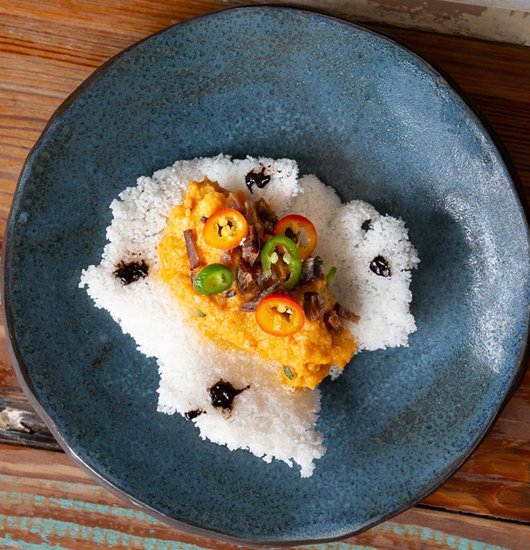 “Toward the end of winter, it gets a little . . . . scary and sparse,” admits Rubba. “Come February, we have this very short farm list. It’s just cellared roots and some kales. Making that creative takes a lot of mental energy.” That’s when Oyster Oyster draws heavily from its pantry of foraged wild plants and ingredients preserved from nearby climate-friendly farms. They lend the food “bright, salty, acidic flavor pops throughout the winter” that wouldn’t otherwise be available, and give his food a joyful exuberance that one critic described as “a garden of good eating.”