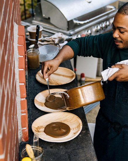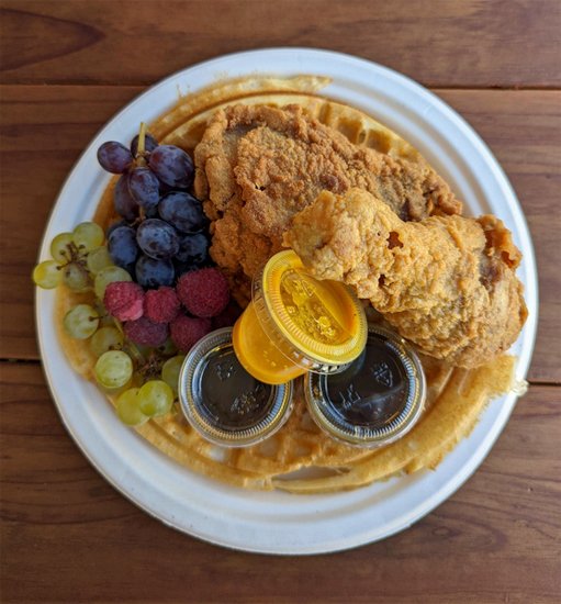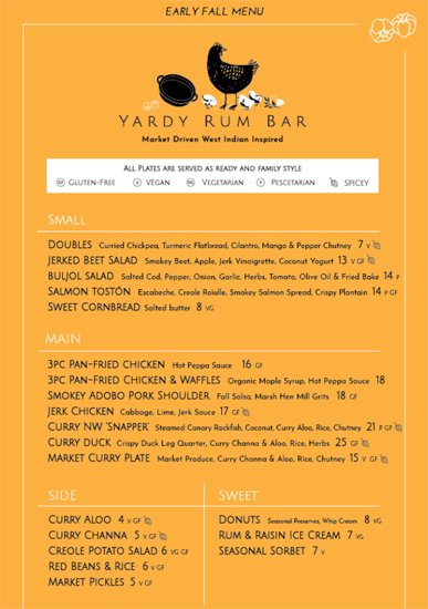 Isaiah Martinez of Yardy Rum Bar prepares a dish for an event spotlighting Black food, sustainability, and inequality in food culture. Center: Yardy Rum Bar’s signature chicken and waffles with seasonal fruit, maple syrup, seasonal jam, and peppa sauce. Right: Yardy Rum Bar’s menu. (Photos courtesy of Yardy Rum Bar)