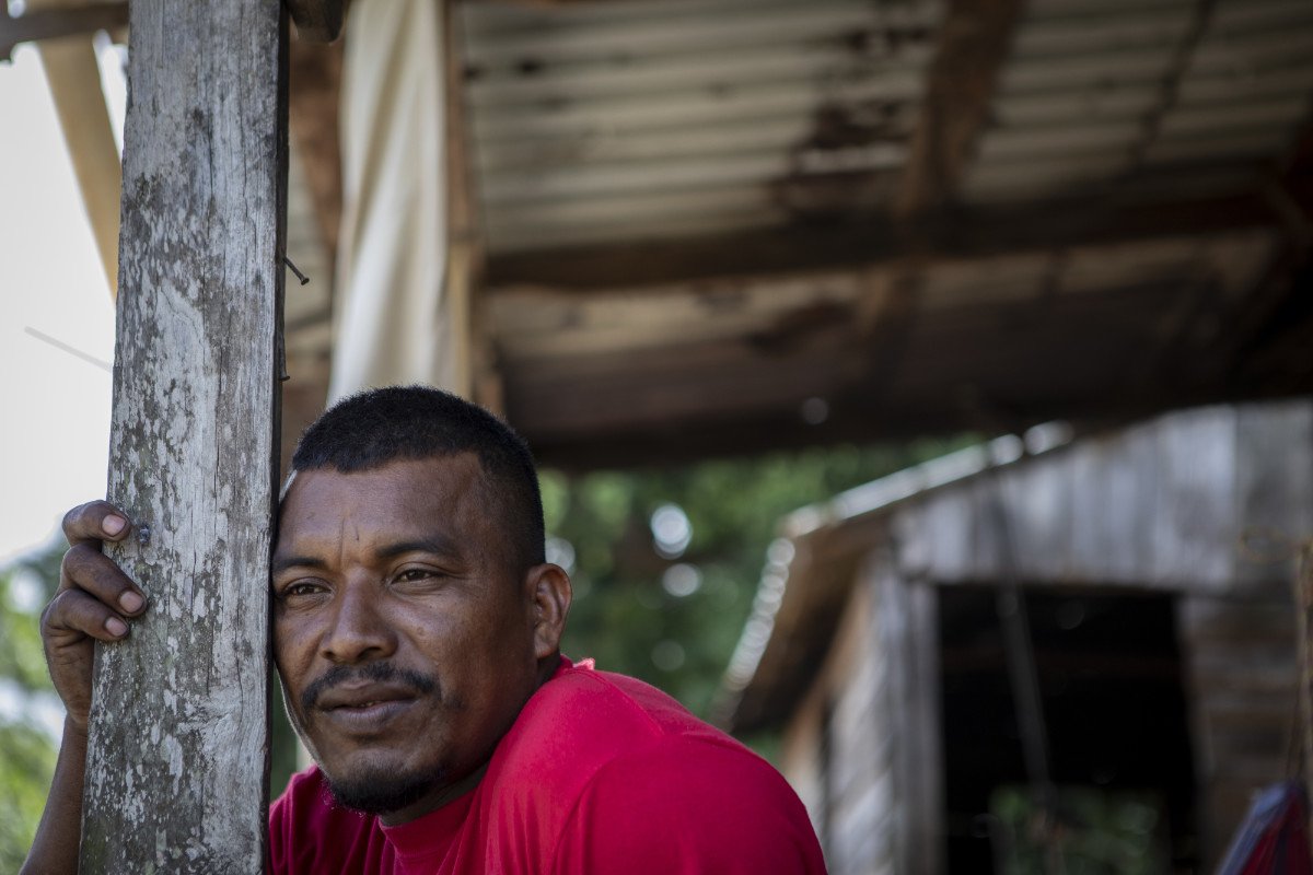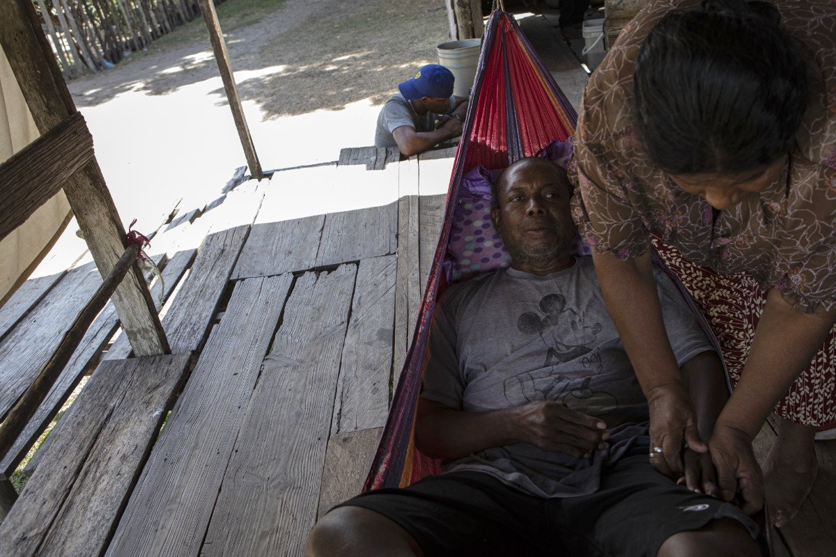Nixon González Flores, 55, a diver paralyzed from the waist down, lived in a wooden house on stilts surrounded by trees upriver from Calderón. He lay on a hammock below the house when I visited, and his youngest son sat in Flores’ wheelchair. Flores became a diver because “there is no work here in La Mosquitia. The only thing is to work in the fishing industry. Diving is dangerous and terrible work.” He was paralyzed at 37 after a 150-foot dive in which the pressure got to him. After the injury, the fishing company didn’t provide financial support. He said, “I have many problems. My body needs a lot of care. I need food, soap, and Pampers. I urinate on myself day and night.”