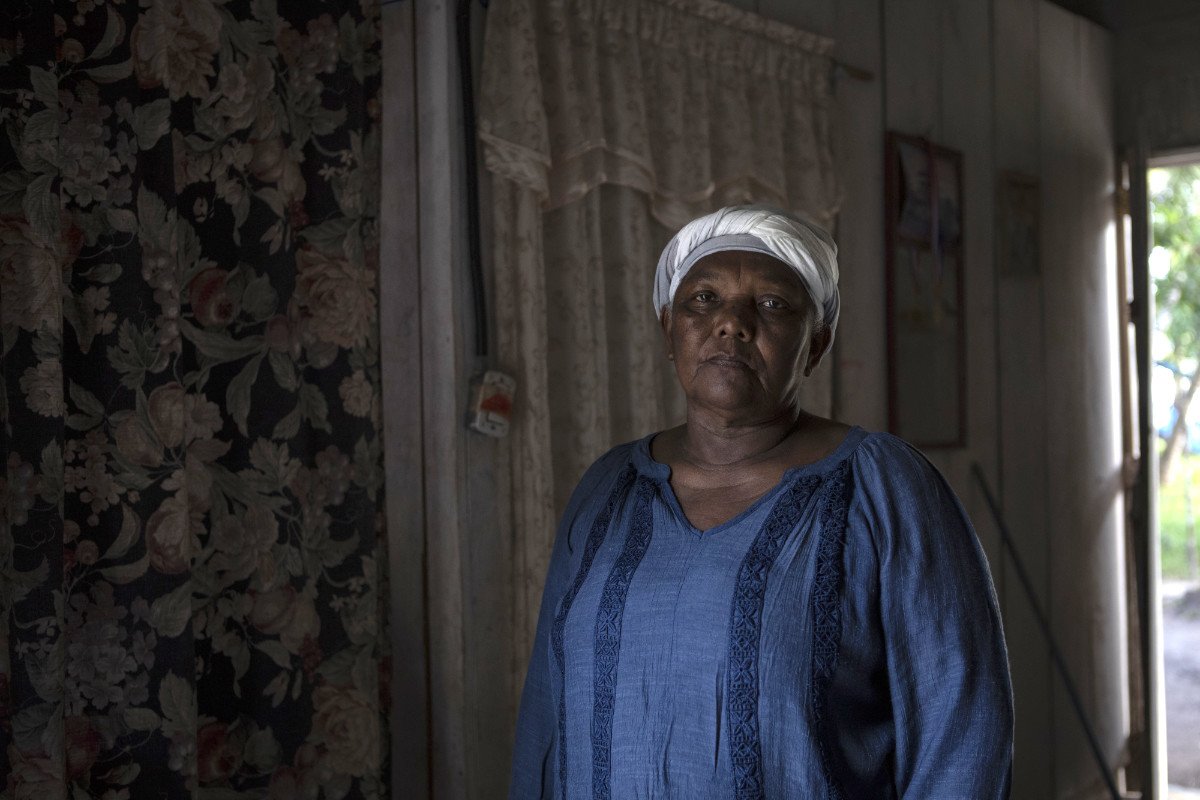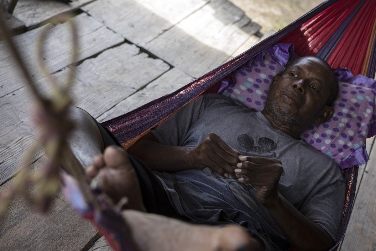 On the muddy banks nearby sits the house of Nixon’s brother Martín González Flores, 61. Walking up the steps to the porch of his house, I saw Martín lying in a hammock, his body stiff, his hands gnarled but shaking. His wife exited the house, reached down, and smoothed his clenched fingers. It was a gentle, practiced gesture. He spoke in a whisper, his lips barely moving, his eyes on the ceiling. At 45, after a deep dive, he experienced a brain hemorrhage. “He took me to the shore and left me,” said Martín of the boat captain. His wife had become his full-time caregiver since the accident. The couple had two children, but one had died in a diving accident.