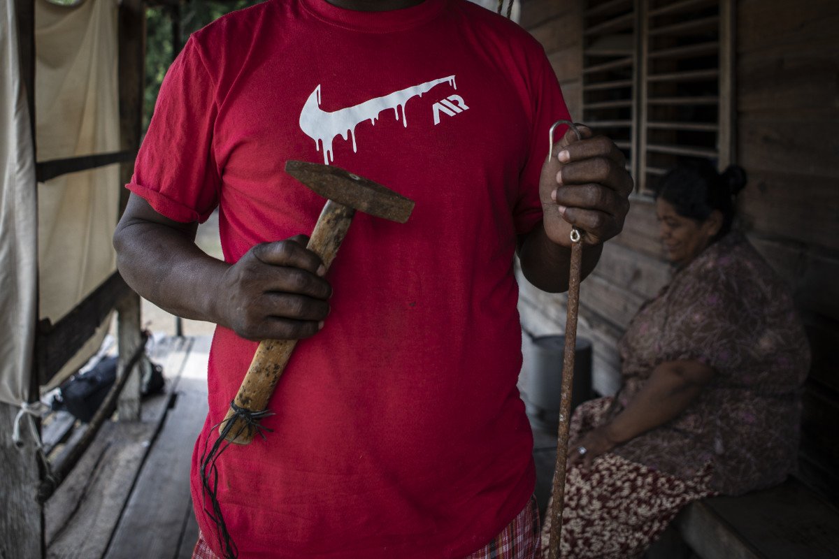 Martín’s son-in-law, Jony Anisal, 36, sat quietly nearby, his feet dangling off the porch. He looked into the distance as he talked about working as a lobster diver. He said of the Miskito community, “We don’t have work. We have to feed our children, our wives.” He got up, went inside the house, and returned with a small, rusted hammer and a rod with a hook—the tools for catching lobster and nearby snails. In addition to his father-in-law, he knew many divers who had been disabled or died, including his own father. Anisal’s brother was a diver, and they often worked together. Their boat captain called them cowards if they got sick and offered them injections, pills, and drugs to keep them diving. “Why did you come if you don’t want to work?” Anisal remembered the captain shouting at him.
