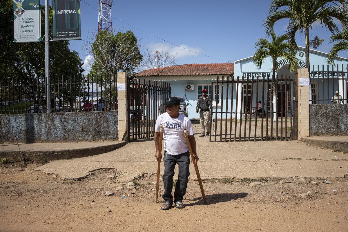 An injured lobster diver walks through Puerto Lempira on his way to a clinic that provides basic services to divers. (Photo credit: Jacky Muniello)