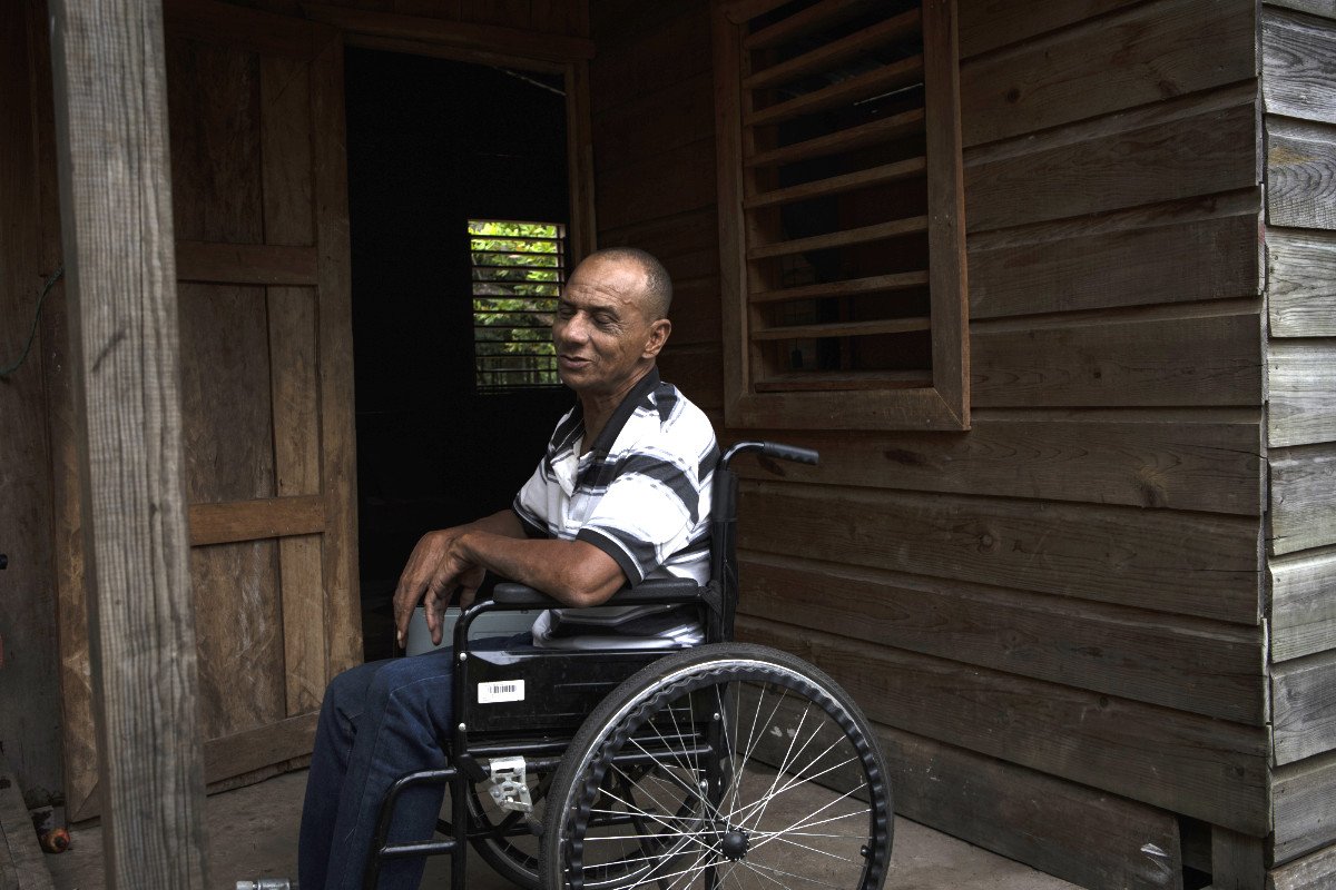 Filemón Cesión Gómez, a former lobster diver who gets around Puerto Lempira in a handmade wooden wheelchair said, “I was injured in 1980 at 25. Many men are dead or disappeared at sea.” (Photo credit: Jacky Muniello)