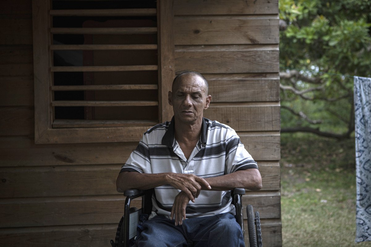 Nixon González Flores, 55, is a diver paralyzed from the waist down. His youngest son sits in his wheelchair. (Photo credit: Jacky Muniello)