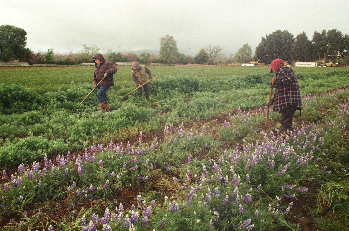 A crew at Hedgerow Farms hoes a Lupinus bicolor field in Winters, California. (Photo credit: Joshua Scoggin/Hedgerow Farms).