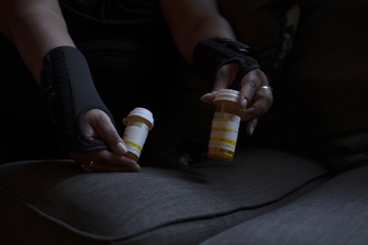 A Tyson worker, wearing two wrist braces for carpal tunnel syndrome, shows some of the medications needed to manage her pain. (Photo by Jacky Muniello for Civil Eats)