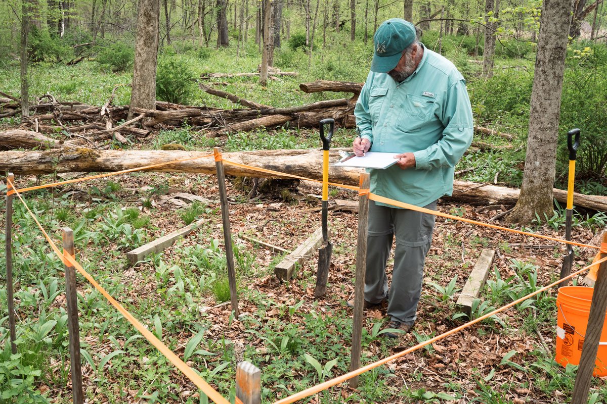 Steven Schwartz takes notes while observing the characteristics of ramps growing in one of six test plots. (Photo credit: Ben Seal)