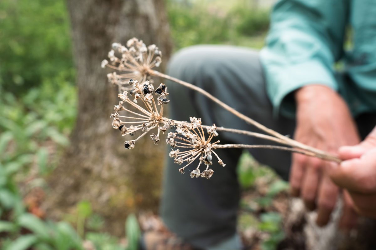 In early May, the woods all around him are carpeted with lush green ramp leaves, clumped so tightly together it’s hard to tell one plant from the next. At last, he finds what he’s been looking for and takes a seat on a fallen log. As a woodpecker hammers in the distance, he picks up a dried seed head, left over from last year.