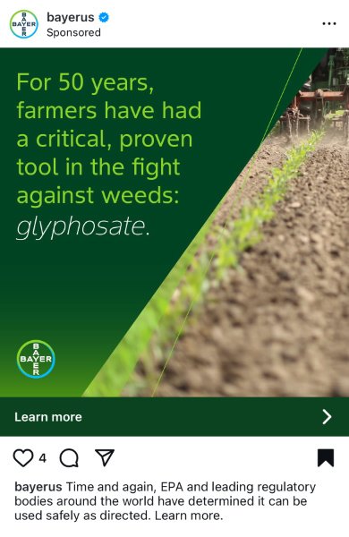 In February, the company sponsored Politico’s Morning Ag newsletter. One ad read, “Farming brings $1.5 trillion to America. Bayer is proud to partner with the country’s farmers to help make that possible.” The ad linked to the company’s “glyphosate guide” with information attributing lower food prices, environmental gains, and economic growth to glyphosate use.