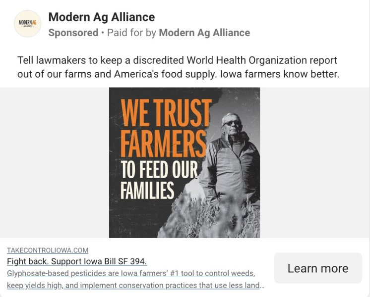 Some of the ads go directly to a page on the Modern Ag Alliance website where one can click on a state and send a pre-written letter to lawmakers supporting a specific bill. In Iowa, the website reports that more than 600 individuals have done so. Meta only requires companies to report spending on political ads, so the $171,000 does not include spending on a deluge of Bayer ads on glyphosate that have been flooding this reporter’s Facebook, Instagram, and LinkedIn feeds, for example, ever since reporting began for this story.