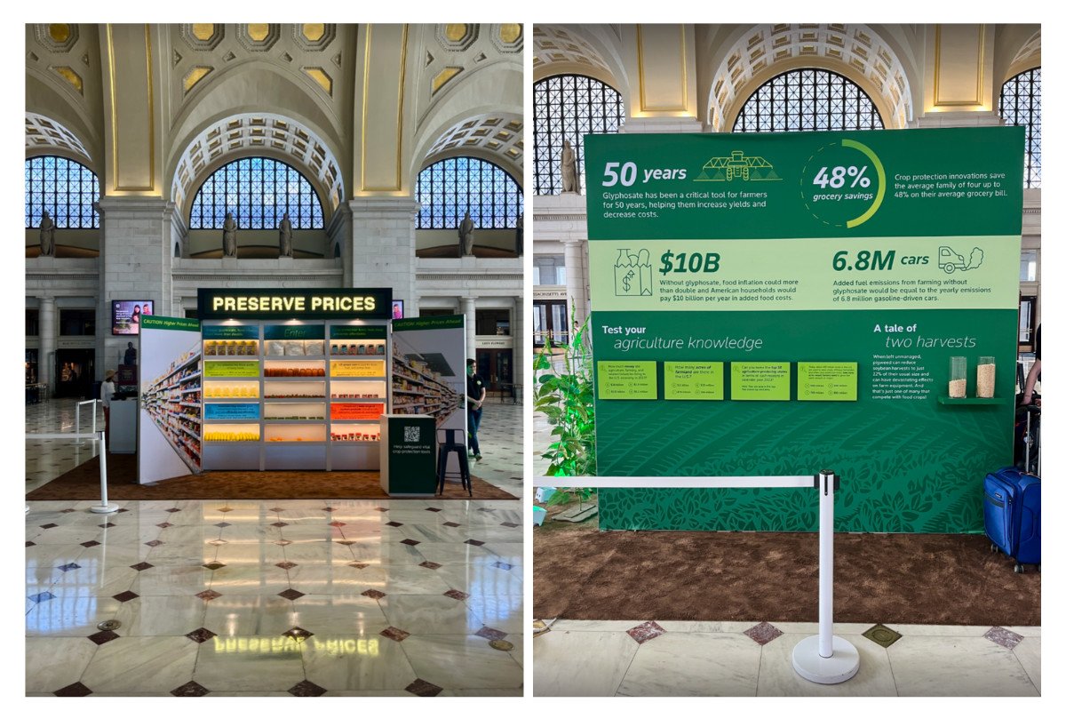 May 9, 2025 update: In May, Bayer stepped up its federal policy efforts with a promotional installation in the center of Washington, D.C.’s Union Station, steps from Capitol Hill. The installation links glyphosate to lower food prices and includes staff who relay that message to passersby: