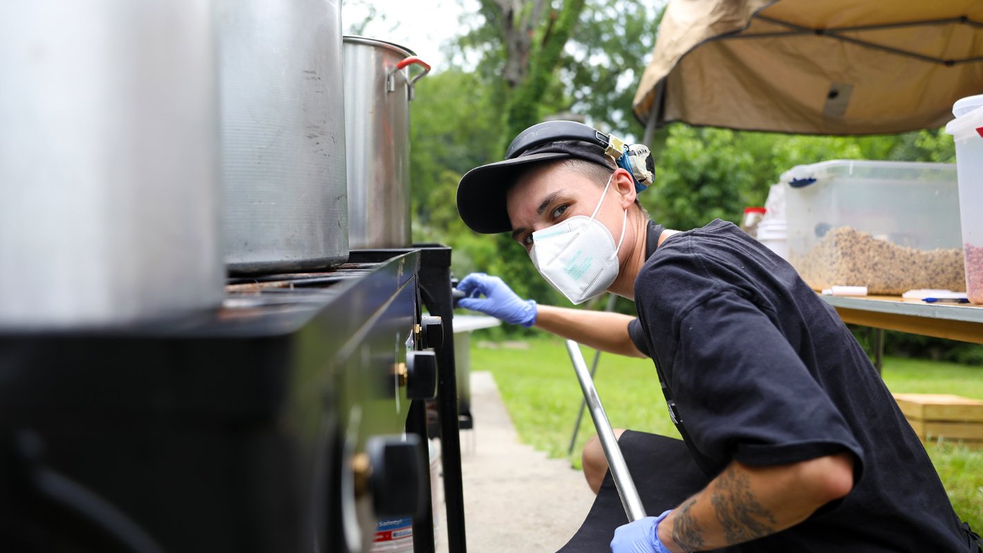 A Feed Durham steward, Grayson spent two years learning to cook on giant 60- and 80-quart steam pots. They burned many beans, and even more rice, until they figured it out. Now, Grayson makes some of the best cabbage, pinto beans, vegan mashed potatoes, and Feed Durham’s Everything But the Kitchen Sink Stew. Remember when we said use all parts of the plants and animals we cook? Veggie scraps like broccoli cores and kale stems get cooked down into a tasty bouillon. We cook on 10 burners. Feed Durham can churn out food for thousands, just with our steam pot setup. (Photo credit: Katina Parker)