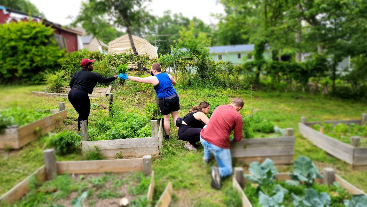 In 2020, Feed Durham volunteers installed eight raised garden beds in my backyard that volunteers help tend. Those beds have grown tomatoes, radishes, quirky carrots with lots of obvious personality, loads of parsley, rosemary, sage, broccoli, cauliflower, collards, and more. In this photo, volunteers harvest fresh herbs right before heading to a produce giveaway. (Photo credit: Katina Parker)