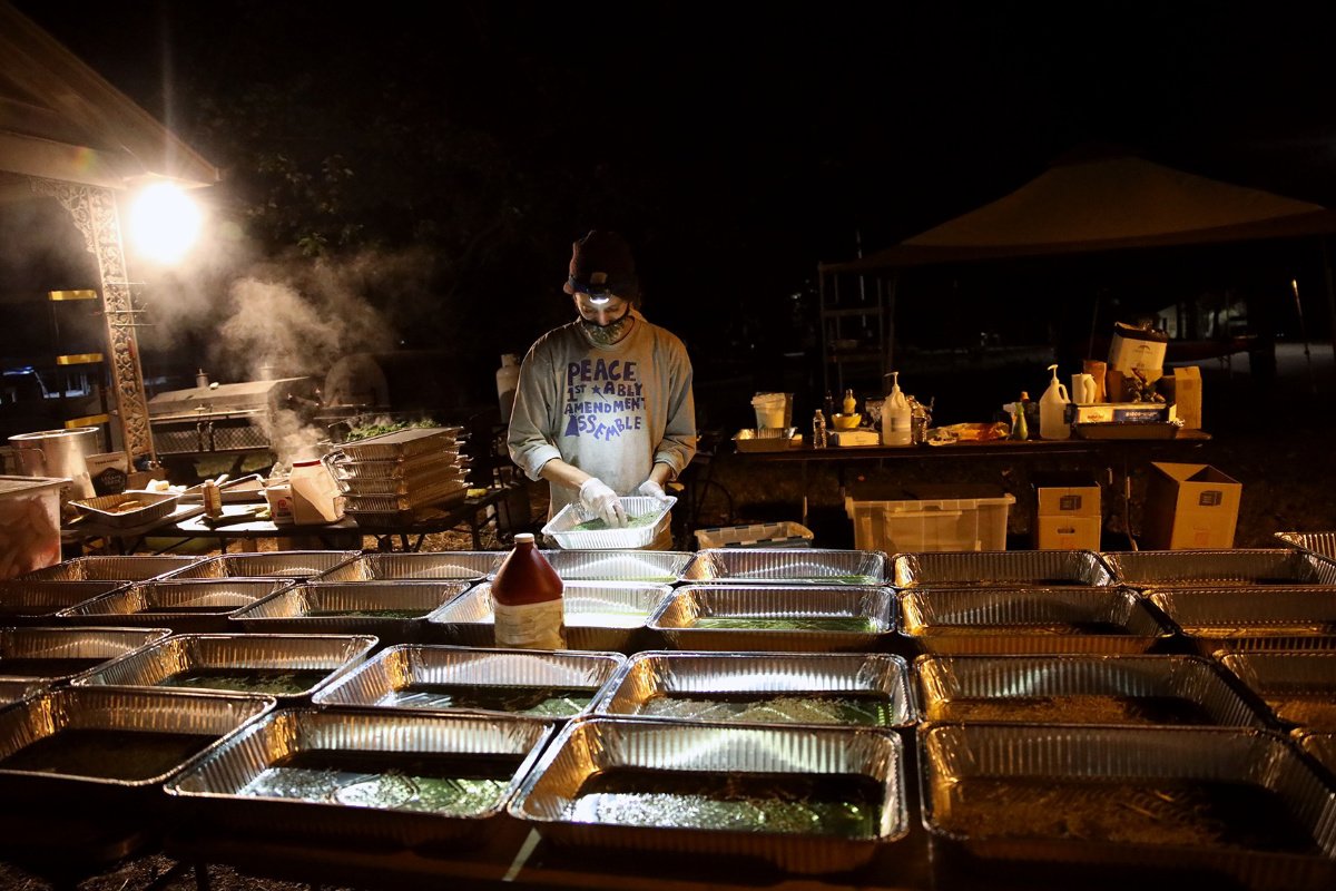Caleb leads a small team of three to five volunteers in washing and seasoning several cases per night. We follow Black and Native practices, using all parts of an animal or plant across multiple dishes. We pay tribute to the animals and plants that die to nourish our bodies with spices, loving energy, and food-preparation processes that accentuate natural flavor. When the chicken comes off the smoker, the drippings will be poured into large spice containers that we send out to missions and churches to use as pot liquor for soups. We jokingly but reverentially refer to the marinade we make for the chicken as a “spiritual bath.” (Photo credit: Katina Parker)