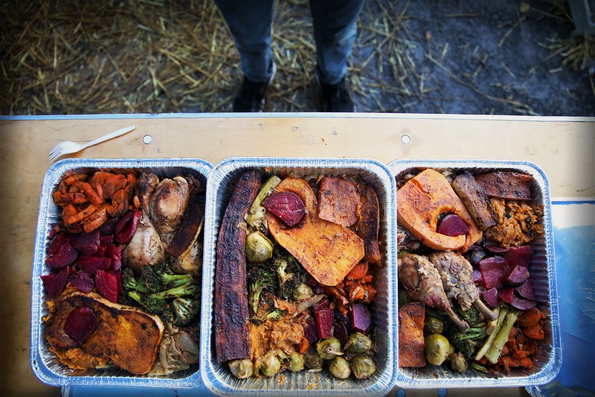 At the end of each cookout, we make family-size plates for volunteers, representing the bounty of every recipe we lovingly prepare. We call them Beauty Plates. This plate features smoked chicken, braised carrot steaks, grilled butternut squash, smoked-garlic Brussels sprouts, charred broccoli, smashed yams, caramelized carrots, and Roasted Beets Tropicale. We’ve developed a way to cook beets that removes the “clean dirt” taste.