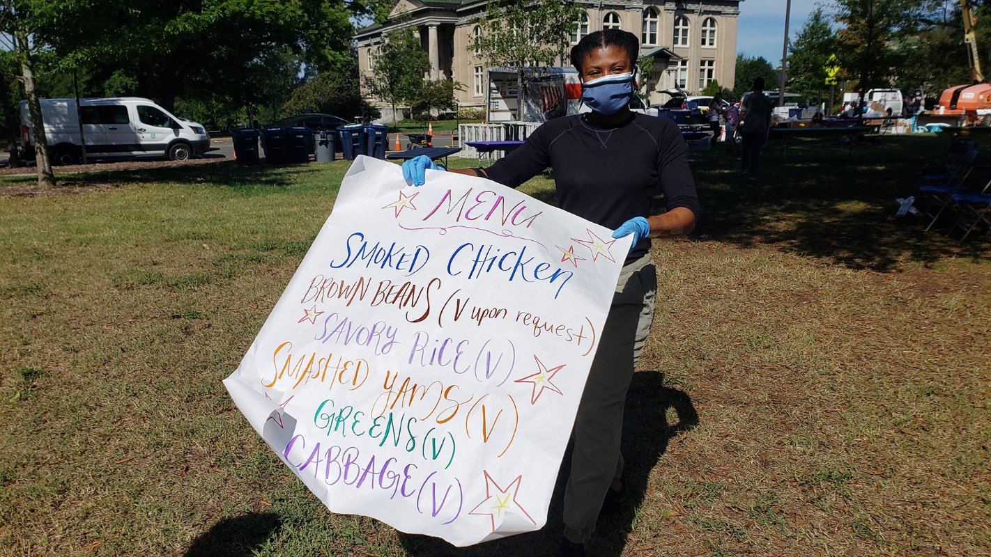 This volunteer, carrying a handwritten Feed Durham menu, is one of several who traveled in from Richmond, Virginia, to study with us as a part of our residency program, which has hosted overnight volunteers from Chicago, Baltimore, Charlotte, and Atlanta. (Photo credit: Katina Parker)