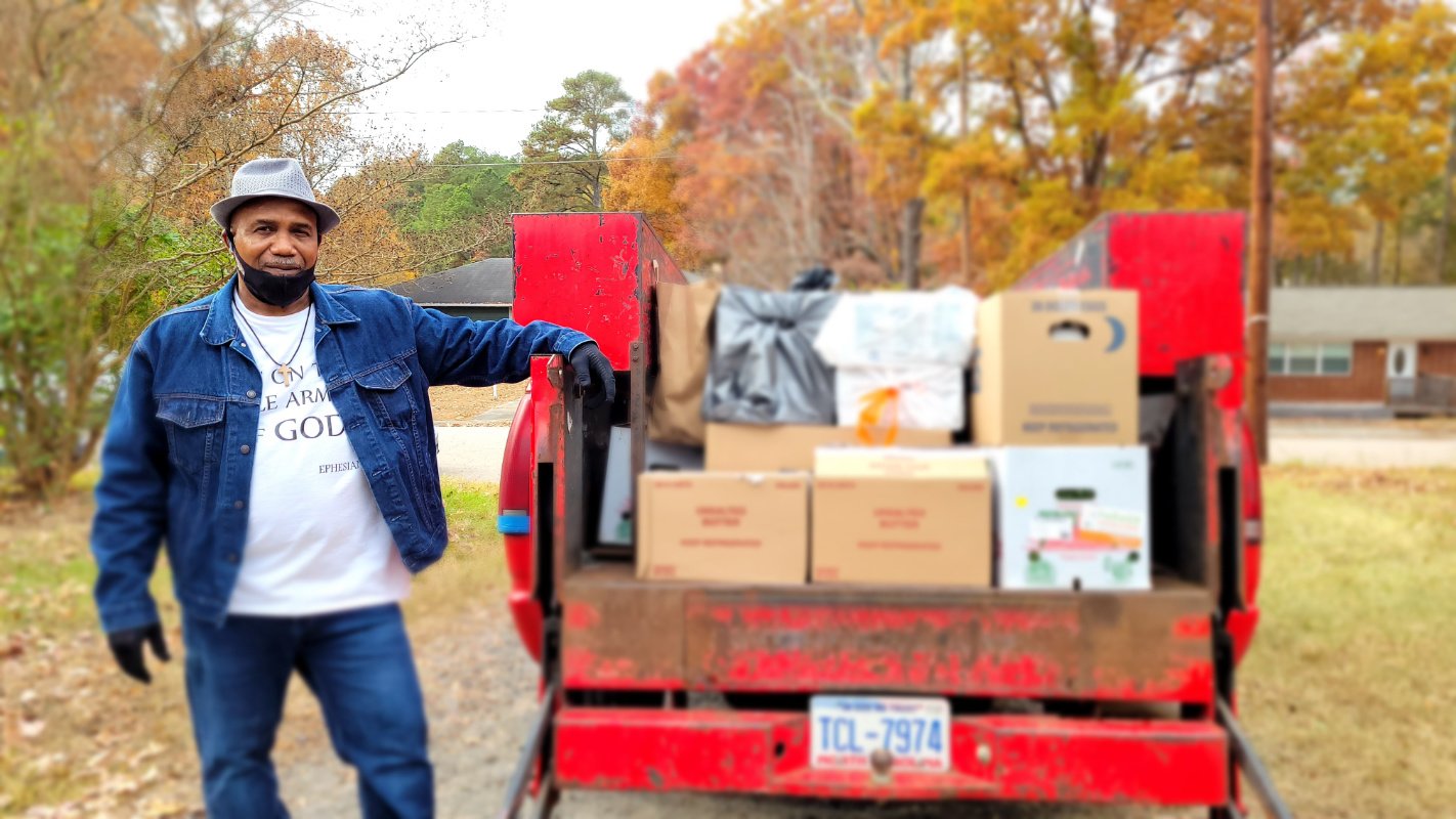 One of dozens of community partners through whom Feed Durham distributes food, Mr. Glenn supports a group of elders and a blind community. Whenever Feed Durham receives texts or emails offering food for pickup, a flurry of texts go out to partners describing what’s available, plus retrieval details. Fun fact: The very cool Coca-Cola truck in the photo happens to have a hydraulic lift that makes hefting boxes in and out of the truck bed easier. (Photo credit: Katina Parker)