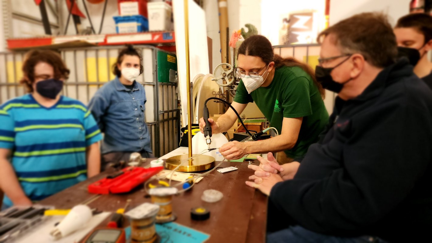 We began offering Repair Clinics to teach tactile skillsets that are rarely taught in school any more, to divert from landfill, and to help neighbors reduce their expenses. Here, volunteer Mark solders a lamp as the owner watches along with other volunteers. (Photo credit: Katina Parker)