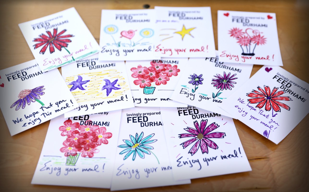 We send Love Notes with each cooked meal or grocery bag. We started this practice during the pandemic, at a time when we all felt isolated and shut off from the world. On printed card stock donated by Spee Dee Que, a local independent print house, teachers, students, and other community members craft notes for their neighbors. Gifted artists create astoundingly beautiful missives. Some messages are general; others are themed for certain holidays, including Pride.