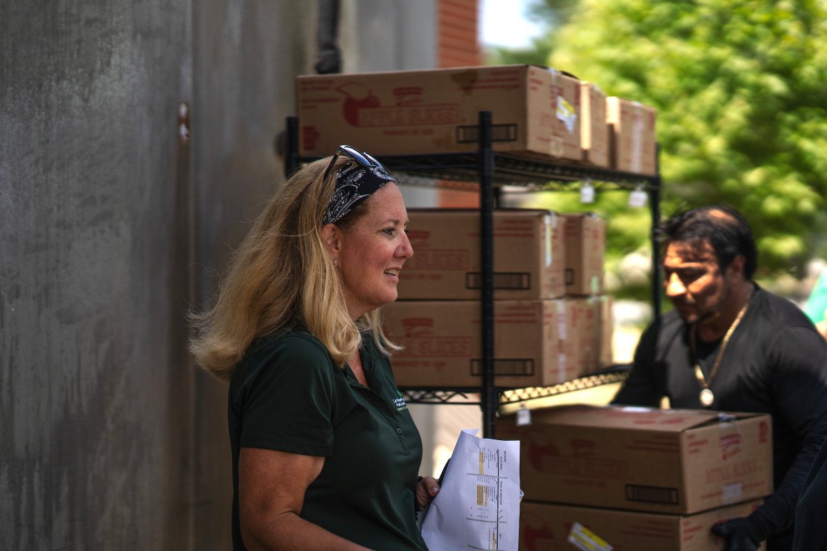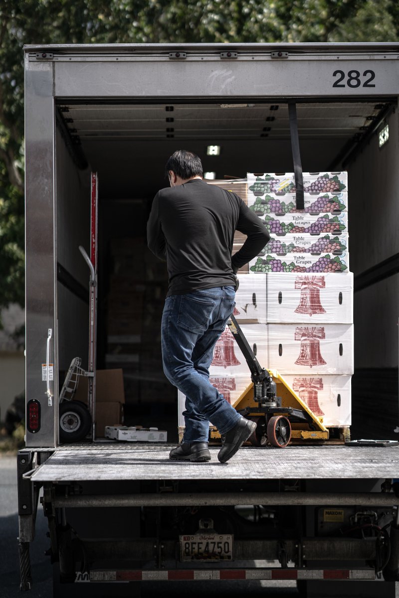 Mid-morning, van driver Meghan Hewitt pulled up with her helper, a high-school student fulfilling community service hours. As the two rearranged bins filled with bags of food so that cartons of milk jugs wouldn’t fall over in transit, a tractor trailer pulled in. “Produce is here!” one of the cafeteria employees yelled, as a delivery worker began moving pallets of grapes, apples, peaches, and honeydew melons from his truck into a stationary refrigerated truck used for storage.