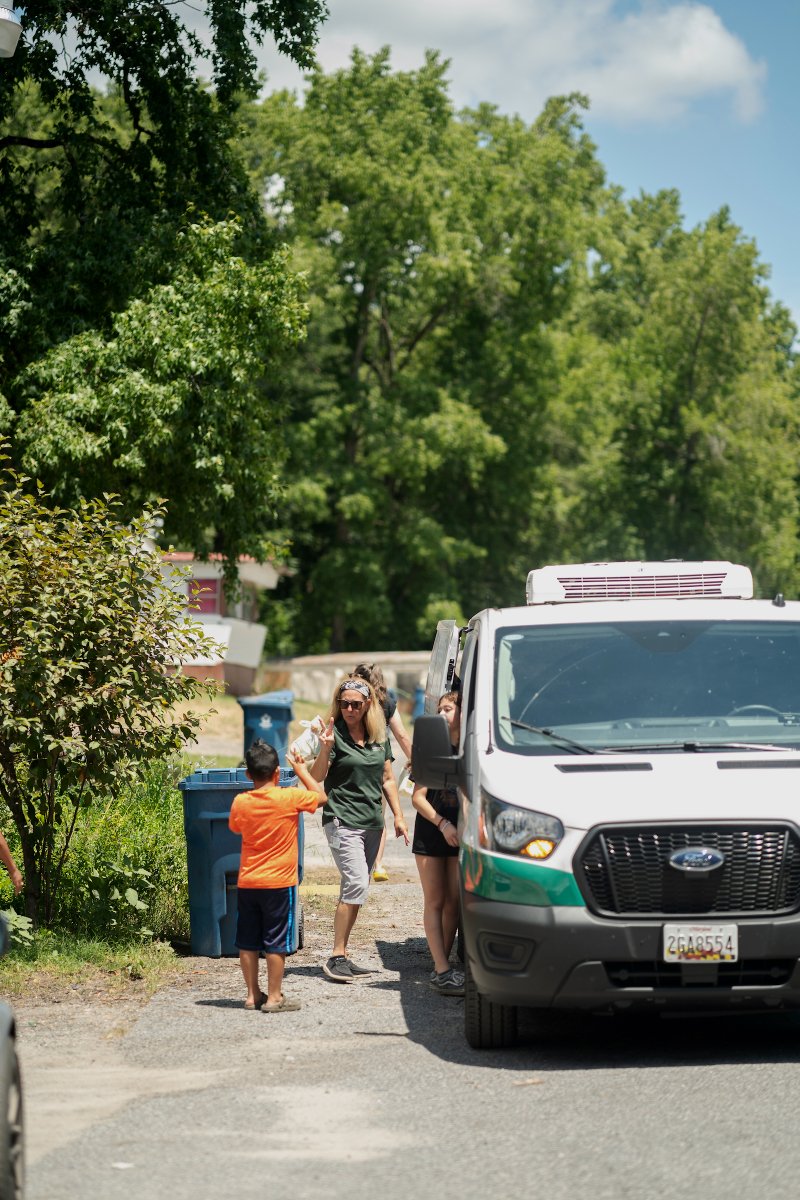 As she pulled into the neighborhood, she began gently, repeatedly tapping the horn outside homes where she had identified—a few weeks earlier—that children were present. It was no ice cream truck, but mothers ushered their children out to greet her at the sound of the arrival.