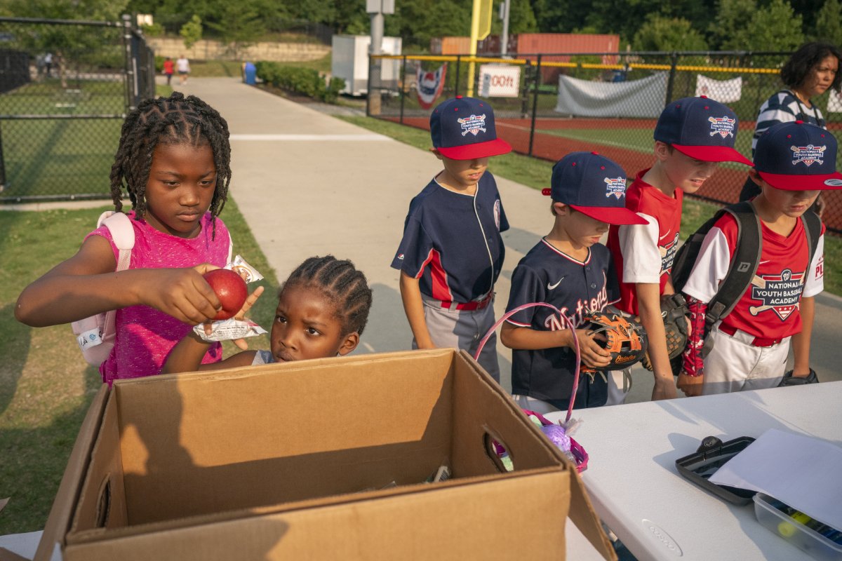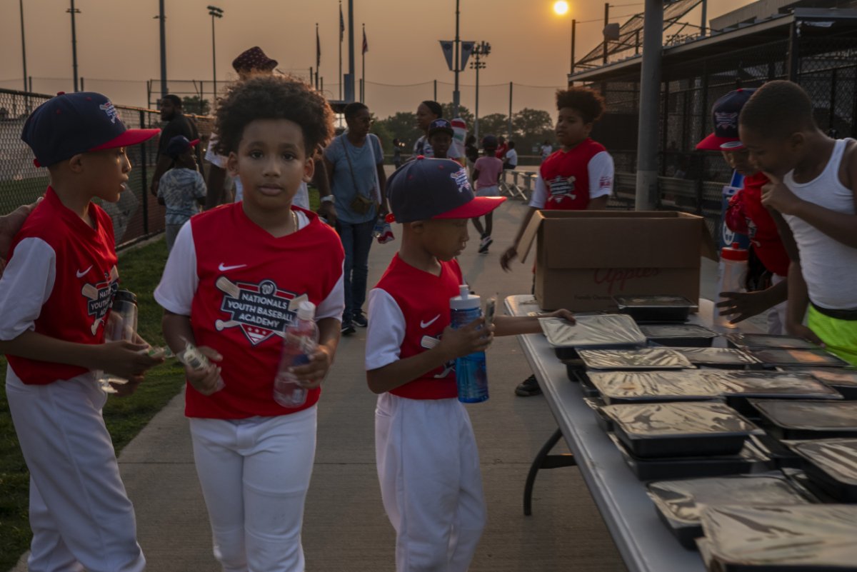 Meals are distributed at Washington Nationals Youth Baseball Academy. Endorsement from a team the kids love makes them more likely to trust the food that is being given out.