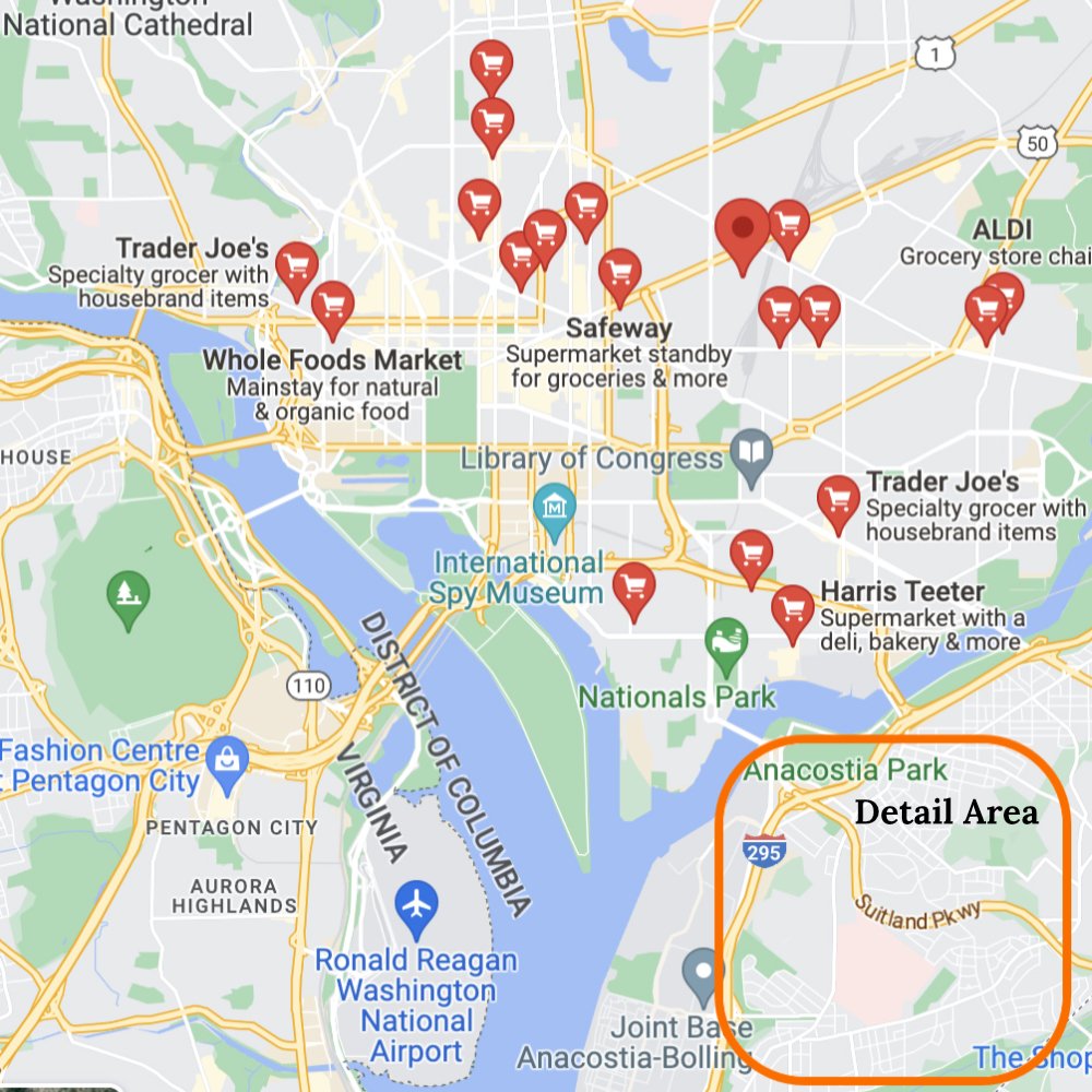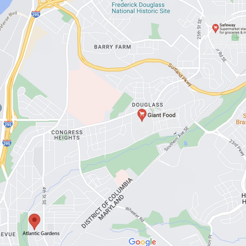 Chesapeake Market is just a two-minute walk from Atlantic Gardens, but it has little to offer in terms of healthy food. The nearest supermarkets are a Giant, 2.2 miles away, and a Safeway with a wider selection but 3.8 miles away. Using public transit to reach the Safeway requires an 80-minute round trip, involving two transfers each way, on buses that arrive about every 30 minutes on weekdays.