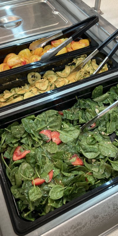 On a recent Friday, Gabby Flores zipped around a snug school kitchen about the size of a freight elevator. With about 30 minutes until lunch, she scooped mac and cheese into 8-ounce paper cups and transferred refrigerated bins of lettuce, corn, and cherry tomatoes to a salad bar in a multi-purpose room that echoed with the tinny squeaks of kids playing trumpets.
