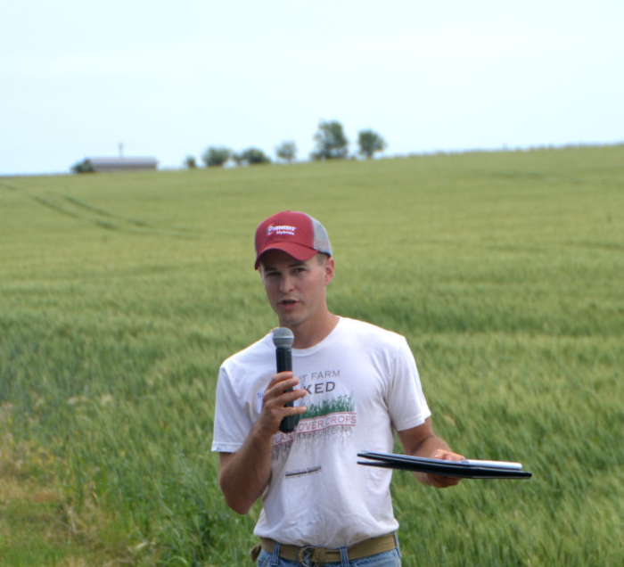 Farmer Nate Anderson shares his cover-cropping and grazing strategies with field day visitors.