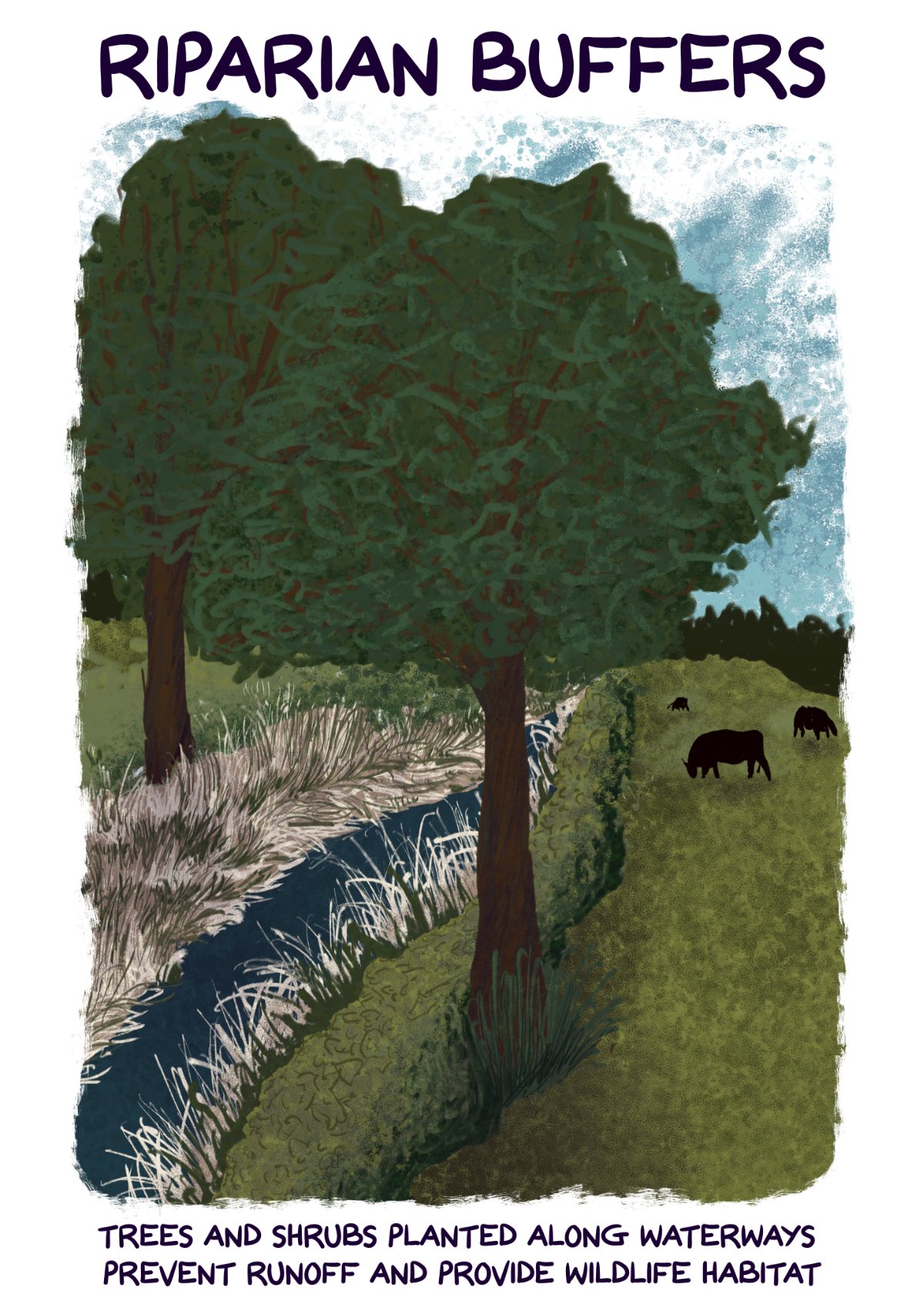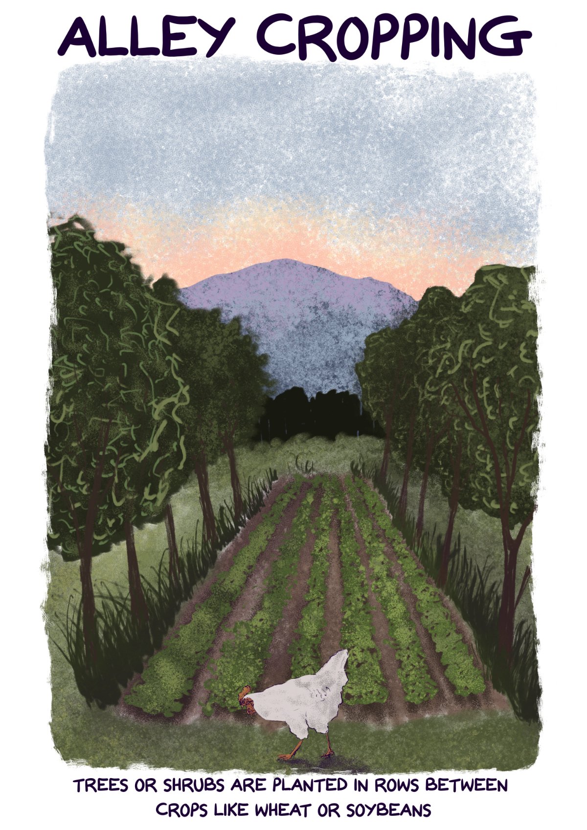 Farmers can plant trees and bushes in strips to prevent soil erosion and provide habitat for wildlife (windbreaks and hedgerows), along streams to stop nutrient pollution (riparian buffers), or between rows of corn (alley cropping). These practices are taking root all across the country.