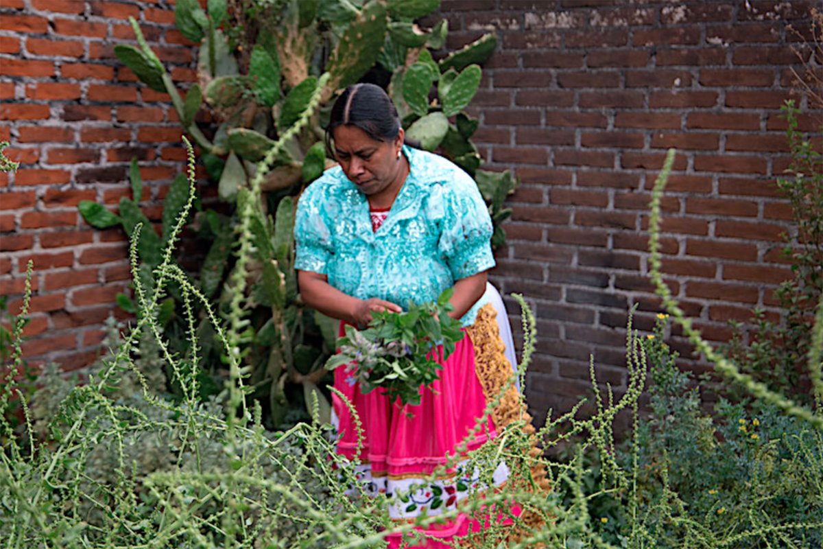 Juana Bravo, an Indigenous P’urhépecha healer, collects herbs from her ekuarho agroforestry garden to prepare a salve and medicinal tea in Angahuan, Michoachán, Mexico. (Photo credit: Monica Pelliccia)