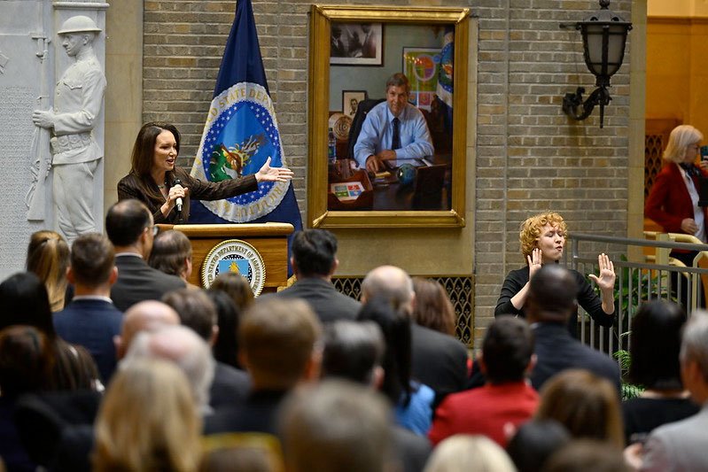 U.S. Secretary of Agriculture Brooke Rollins makes her first official address to employees at the USDA Headquarters in Washington, D.C, on Feb. 14, 2025. Four weeks later, she announced plans to make faster line speeds permanent for pork and poultry. (Photo credit: Paul Sale, USDA, via Flickr)