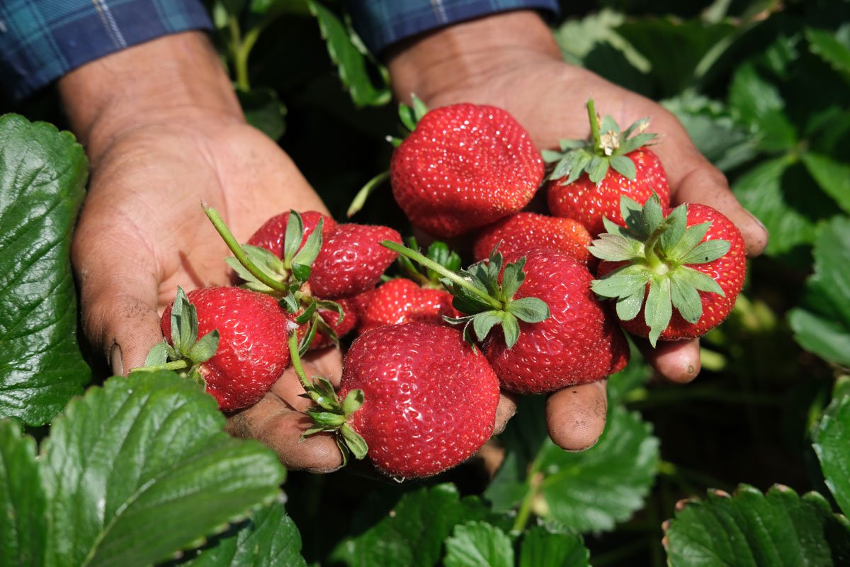 Ram Khatiwoda holds freshly picked strawberries at New Roots farm, where refugees grow fruit, vegetables, and herbs. (Photo credit: Caleb Hampton)