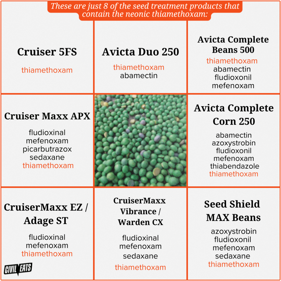Over the course of three weeks in October, Civil Eats sent at least four interview requests and detailed questions to CropLife America, which represents the pesticide industry, but did not receive a response. We also sent emails to press contacts at the companies that make or sell pesticide and seed products mentioned in this story: Corteva (which owns Pioneer) and Winfield United (owned by Land O’Lakes) did not respond. A spokesperson for Syngenta directed Civil Eats to “Growing Matters” and sent a statement that reads, “Planting seeds treated with crop-protection products is a more precise way for farmers to protect their crops from early season pests and diseases. As you can see from our global Seedcare Institute website, Syngenta is a leader in providing treated seeds of the highest quality and committed to helping farmers achieve their yield goals sustainably.”
