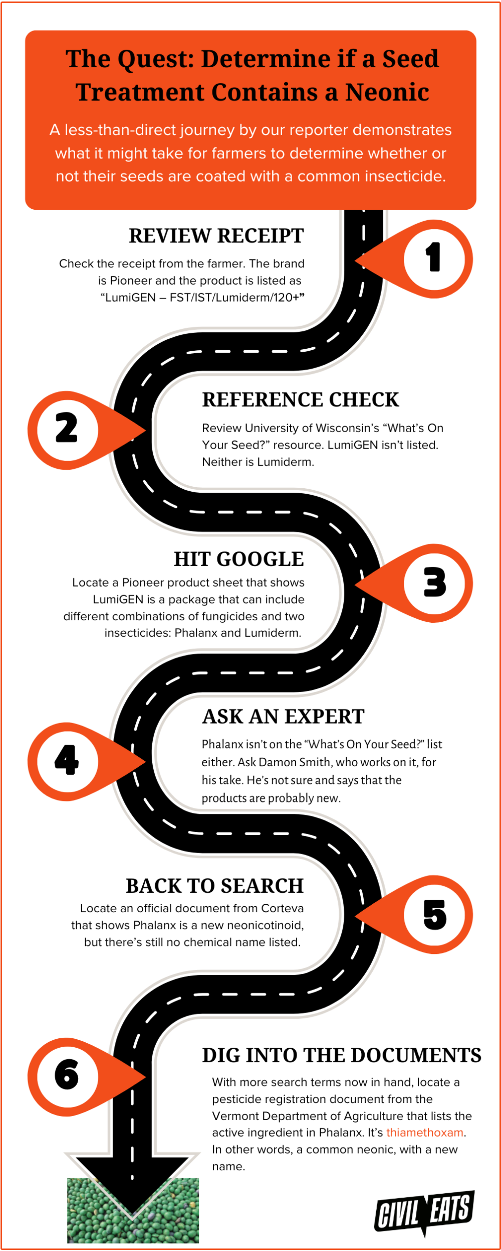 With the name of Dengler’s product in hand, Civil Eats tried to find out for him if the soybean treatment he had used contained a neonic. Because it was a newer product and wasn’t yet listed in Damon Smith’s resource, it took significant searching and emailing to track down the chemicals included. The insecticide was thiamethoxam—one of the most common neonics.