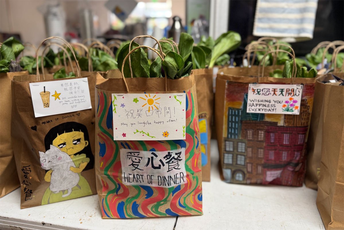 Each bag, destined for Asian seniors living in nearby public housing, was festooned with colorful, uplifting artwork by volunteers from across the city: drawings and paintings of birds, lanterns, fruit, flowers, and other Asian-themed imagery. “Heart of Dinner” was written in Mandarin characters on the bags, with a personalized note stapled beneath the handle.
