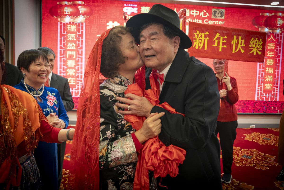 Each year during Valentine’s Day celebrations, Ng invites a couple on stage to commemorate their marriage. Here Qi Xiong He, 78, has just lifted the veil of his wife, Ju Ying Zhou, 66. Traditionally the veil is lifted when the couple are alone in their bridal chamber after the wedding ceremony.