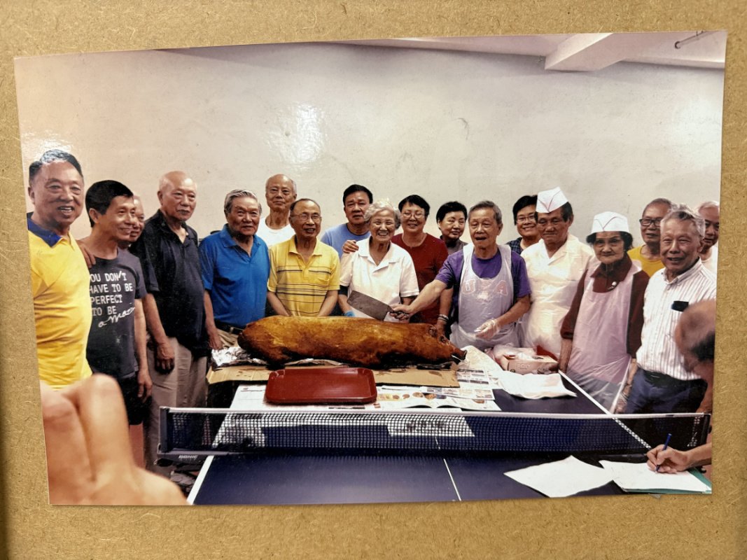 A photo on the wall in the table tennis room at Open Door, taken several years ago. After a championship match, someone donated a whole roast pig to the players (and friends) to enjoy.