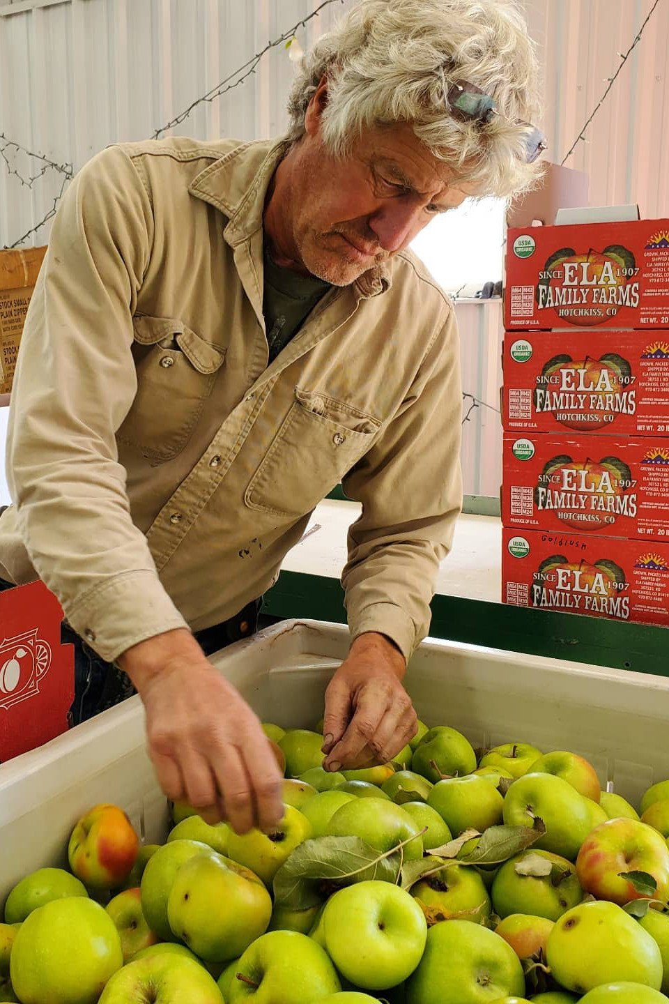 Steve Ela packs apples at Ela Family Farms, where he’s recently taken trees out of production due to concerns about water availability. (Photo credit: Regan Choi)