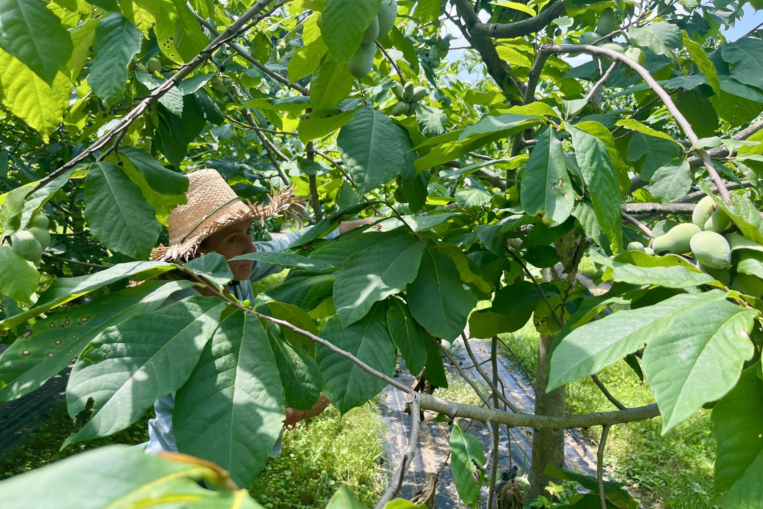 Elisa Lane in her pawpaw orchard. “I’ve heard people say that farmers are on the frontlines of climate change,” she said. “Someone smarter than me said that, but it’s true.” (Photo credit: Lisa Held)