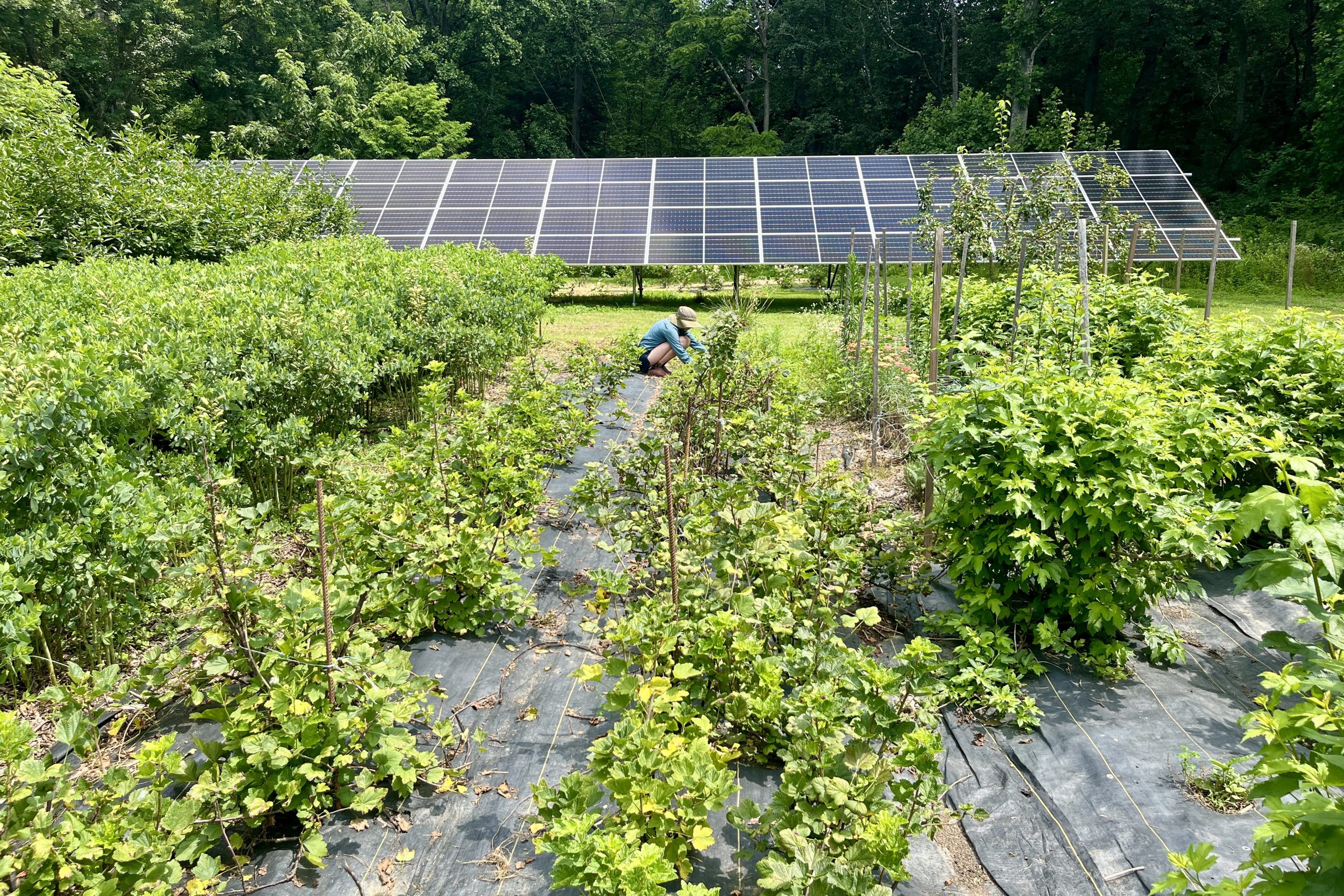 A worker at Two Boots Farms hand-weeds a pesticide-free field during a heat advisory. Behind her is the solar array that was delayed due to the USDA funding freeze. (Photo credit: Lisa Held)