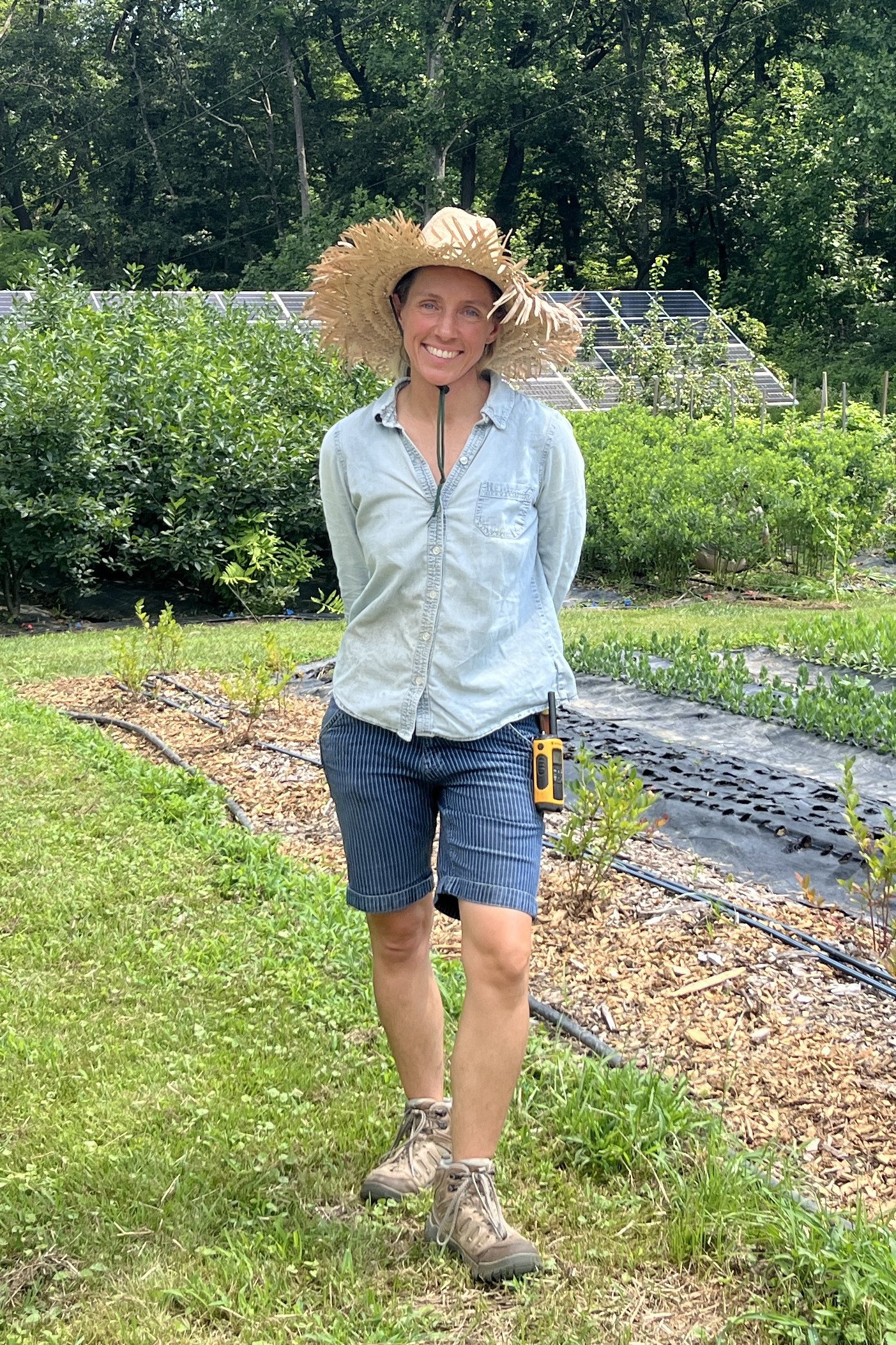 Elisa Lane, owner of Two Boots Farm, with the solar array that sits behind her fields on the edge of forested acres. Installation of the system was delayed to the USDA funding freeze. (Photo credit: Lisa Held)