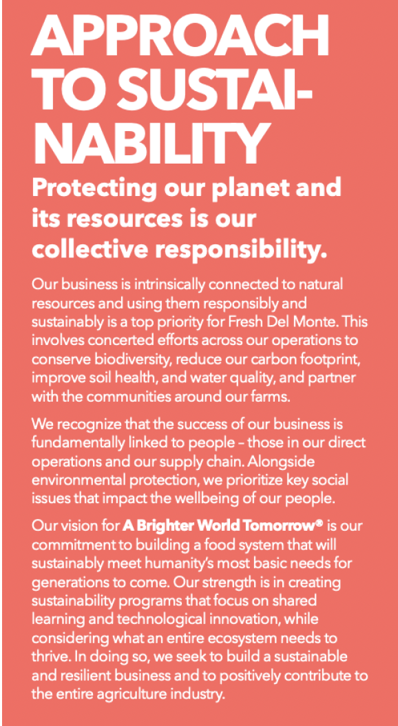 The Del Monte lawsuit notes that people are becoming increasingly concerned about the impacts of their food. Consumers, says the filing, are motivated to buy produce marketed as “sustainable” and are often willing to pay more for it or to buy more of it. “Corporations that market these products, such as Del Monte, are keenly aware of this consumer willingness,” the filing states.