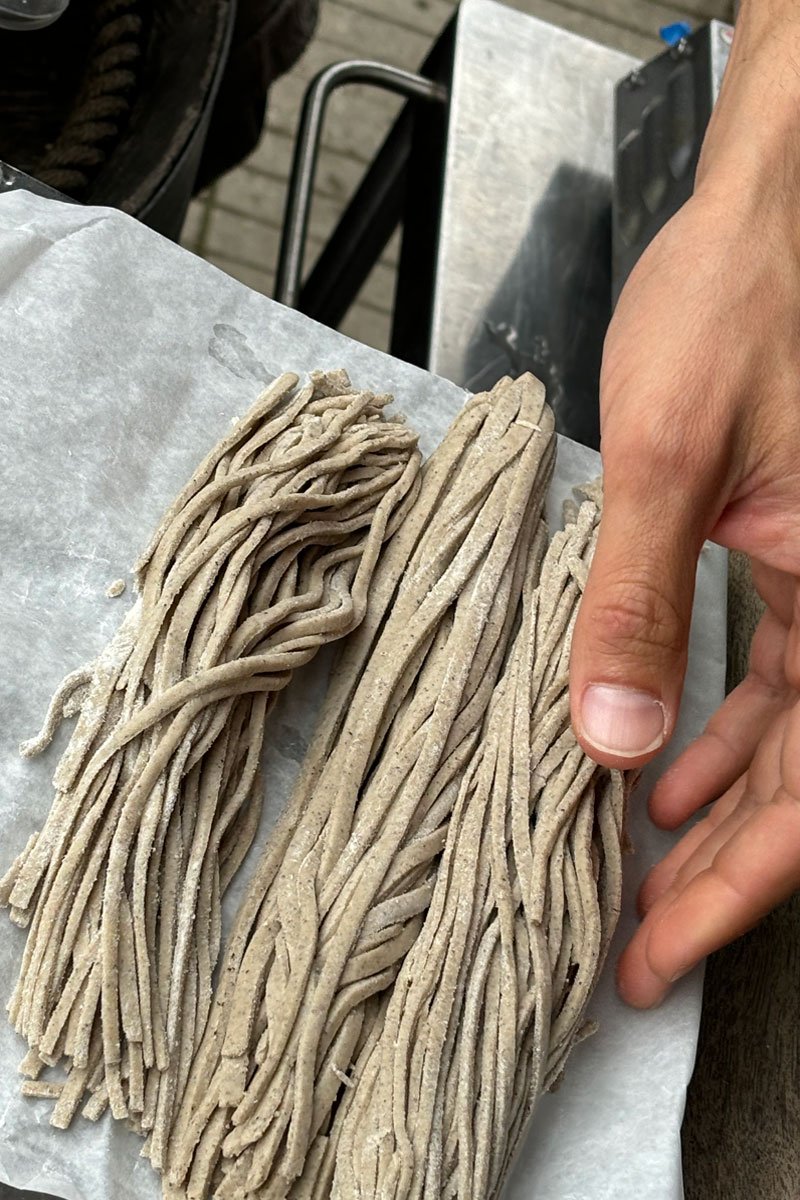 Buckwheat flour can be used in a range of recipes, including noodles, pictured here, as well as crêpes, blinis, and cookies. (Photo credit: Crystie Kisler, Chimacum Valley Grainery)