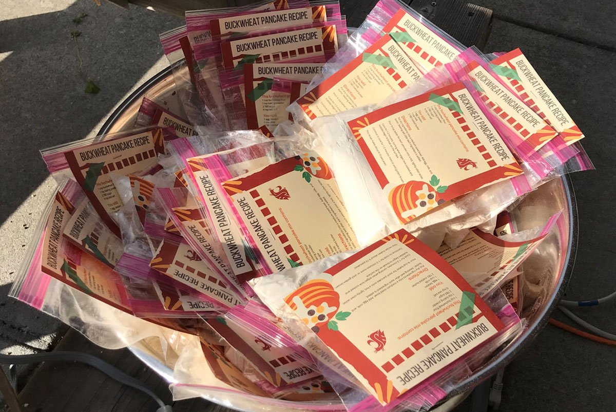 Buckwheat pancake-mix packets at the Thurston County Fair, created by WSU Extension. At the booth, kids could grind their own buckwheat flour for the packets using a hand-crank mill. The booth was extremely popular, with some kids returning two or three times to grind more buckwheat groats. (Photo credit: Stephen Bramwell)